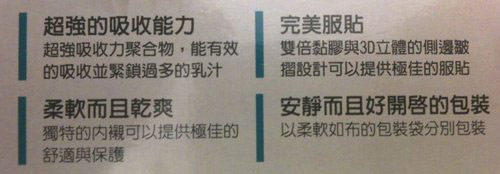 超強的吸收能力 / 完美服貼 / 柔軟而且乾爽 / 安靜而且好開啟的包裝