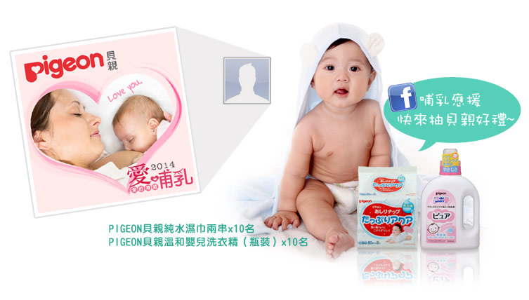 2014年4月2日(二)~2014年5月11日(日)止,前往台灣貝親粉絲頁完成指定步驟,即可參加抽獎,將PIGEON貝親產品帶回家!