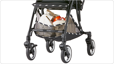 容量大的置物籃,可確實收納大型媽媽包、嬰兒 用品袋,無論前後方向皆可拿、放用品,使用相當方便。