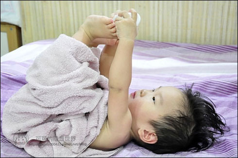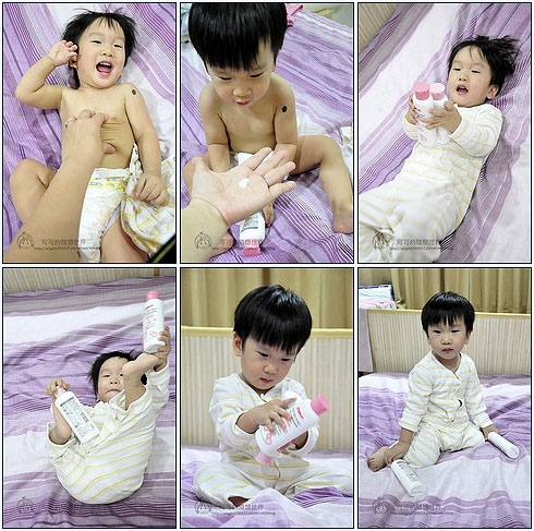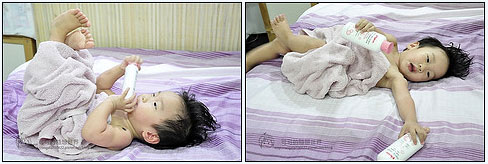 可樂媽總是趁這個時間,幫樂樂用乳液來個全身按摩。