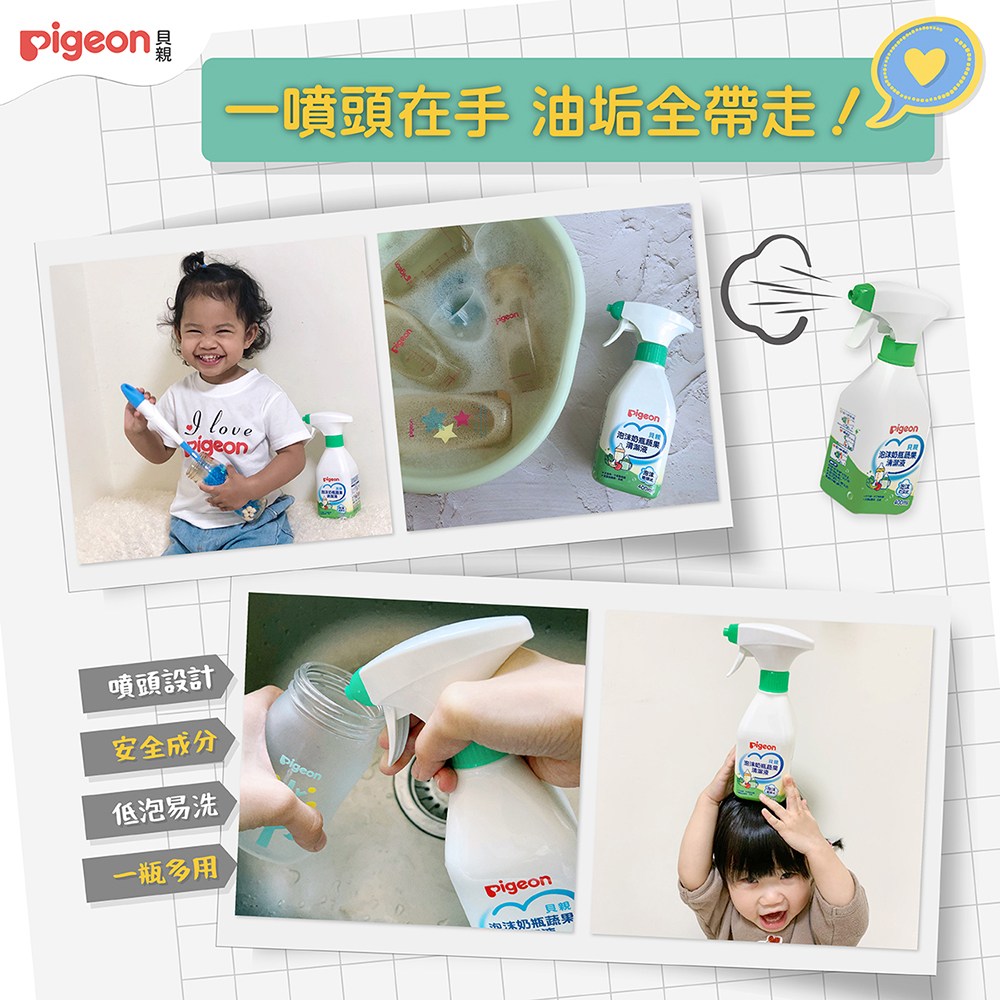 飛:「現在有了這罐貝親噴頭式泡沫奶瓶蔬果清潔液,清洗完後又更安心❕🥰」