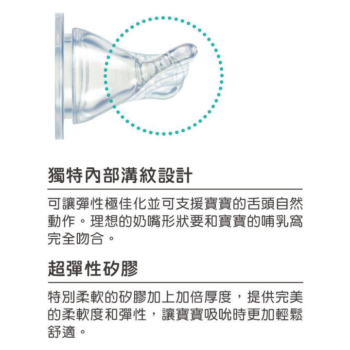 ★超彈性矽膠是將特別柔軟的矽膠加上加倍厚度,提供完美的柔軟度和彈性,讓寶寶吸吮時更加輕鬆舒適。