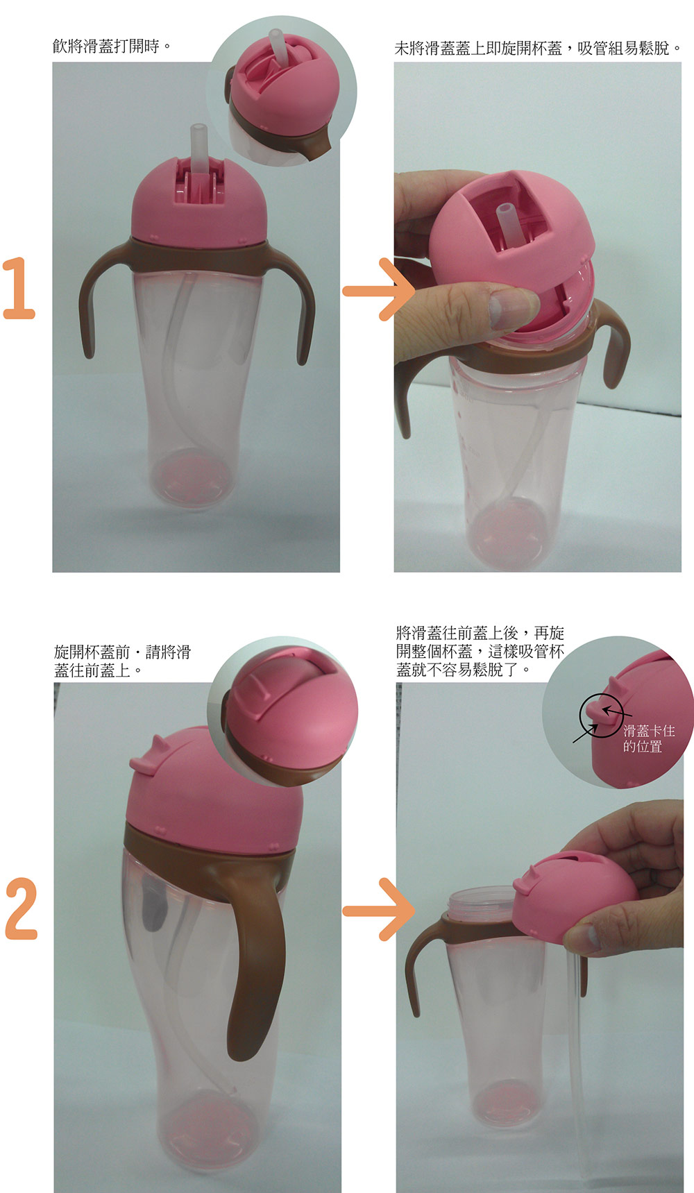 請爸媽們在打開杯蓋前先將滑蓋蓋上,這樣在為寶寶添加飲水,旋開整個杯蓋時,吸管杯蓋就不會再鬆脫了。