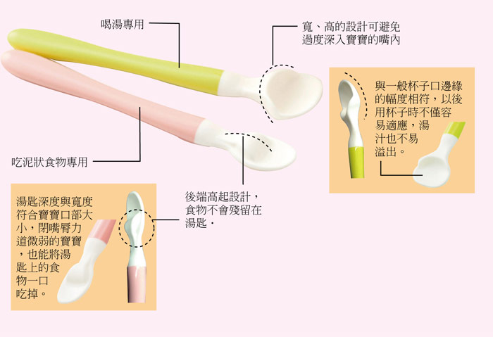 特別依據分為『液態』及『泥狀』食物,設計出兩支配合不同需求的湯匙