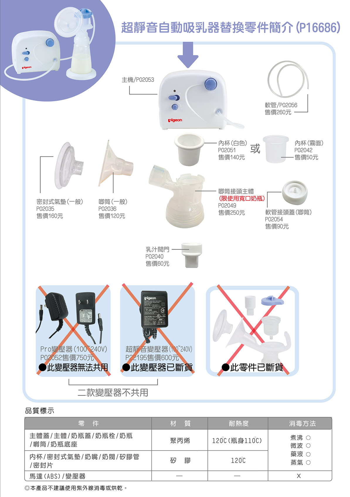 舊款超靜音電動吸乳器(P16686),因有多項零件己缺貨, 請各位媽咪參考附表零件選購所需零件。