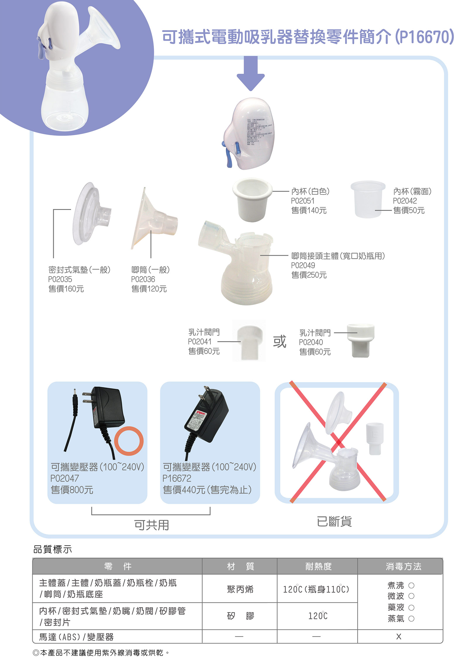 舊款超靜音電動吸乳器(P16670),因有多項零件己缺貨, 請各位媽咪參考附表零件選購所需零件。