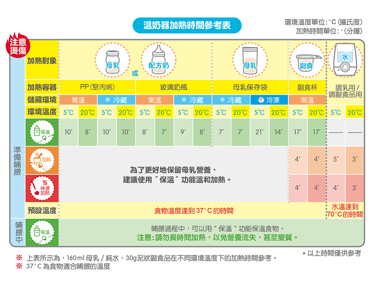 還在為溫奶器如何設定溫度而煩惱嗎? 這裡提供簡單易懂的【溫奶器加熱時間參考表】讓使用溫奶器時更快上手哦~